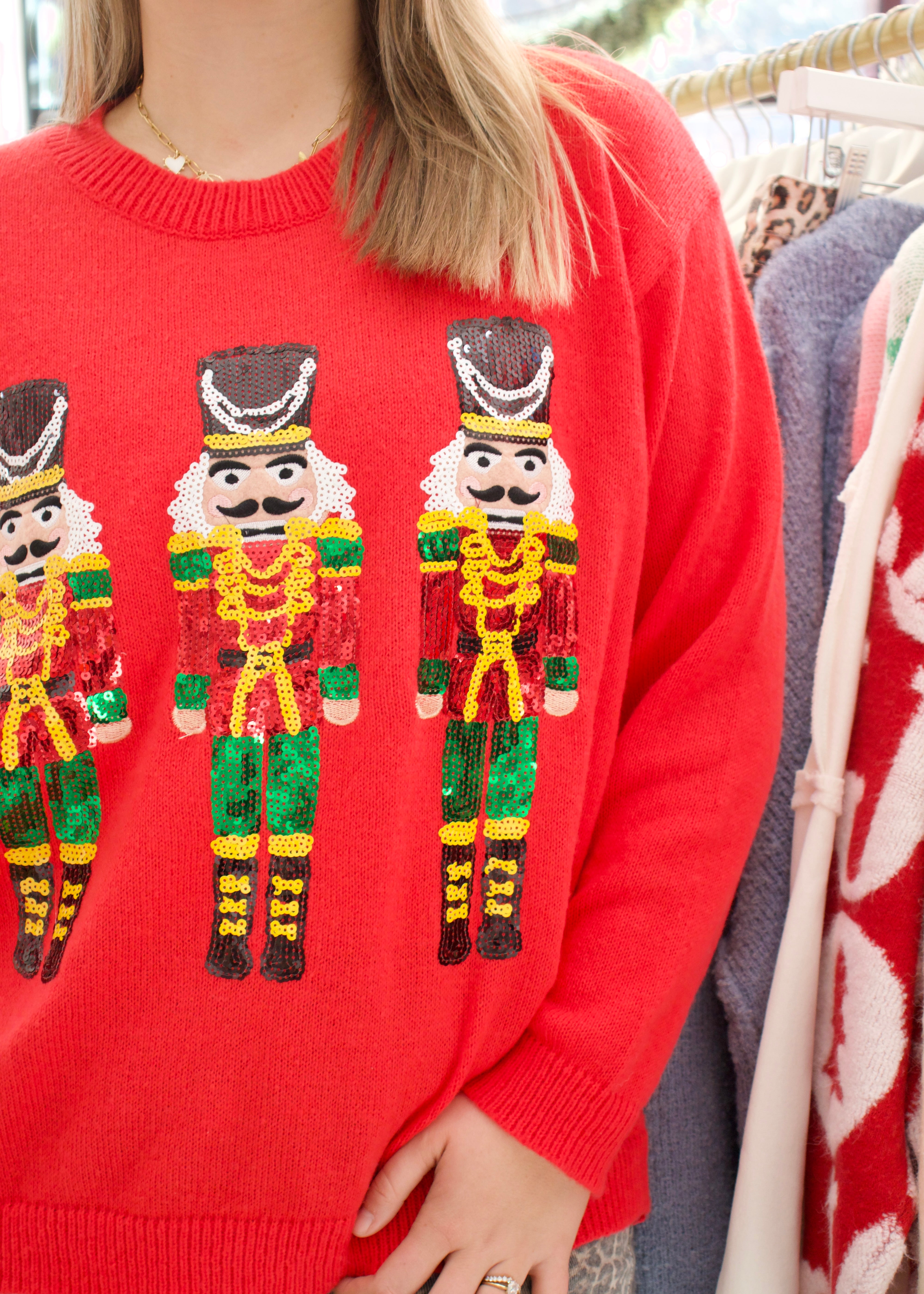 Sparkle and shine this season in a bold red sweater adorned with shimmering sequin nutcrackers. This festive piece brings a touch of glamour to your holiday wardrobe, transforming a classic sweater into a statement-making celebration of the season. The playful nutcracker design catches the light beautifully, making you the star of every holiday gathering. Cozy, eye-catching, and unapologetically festive—this is the sweater that steals the show.