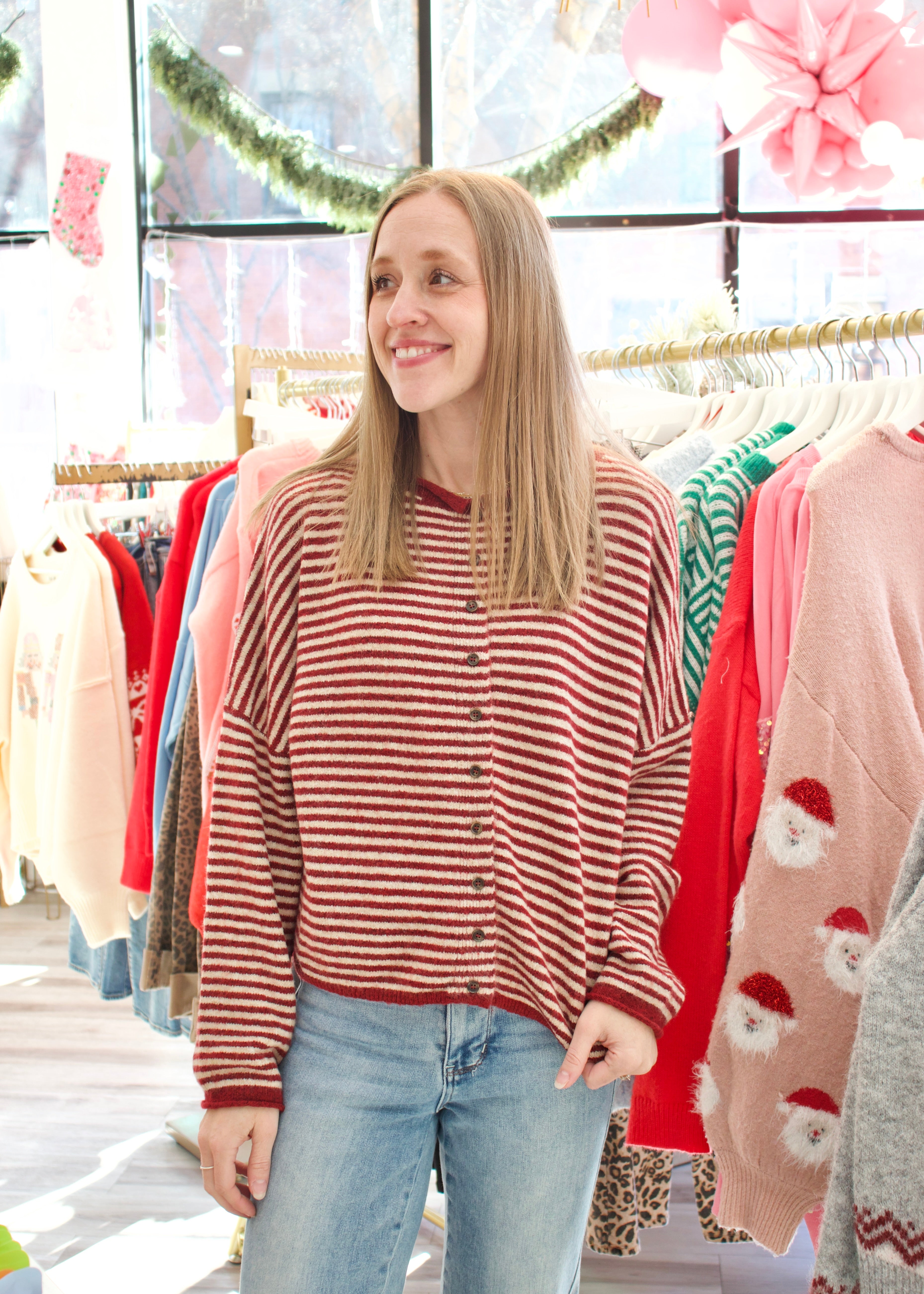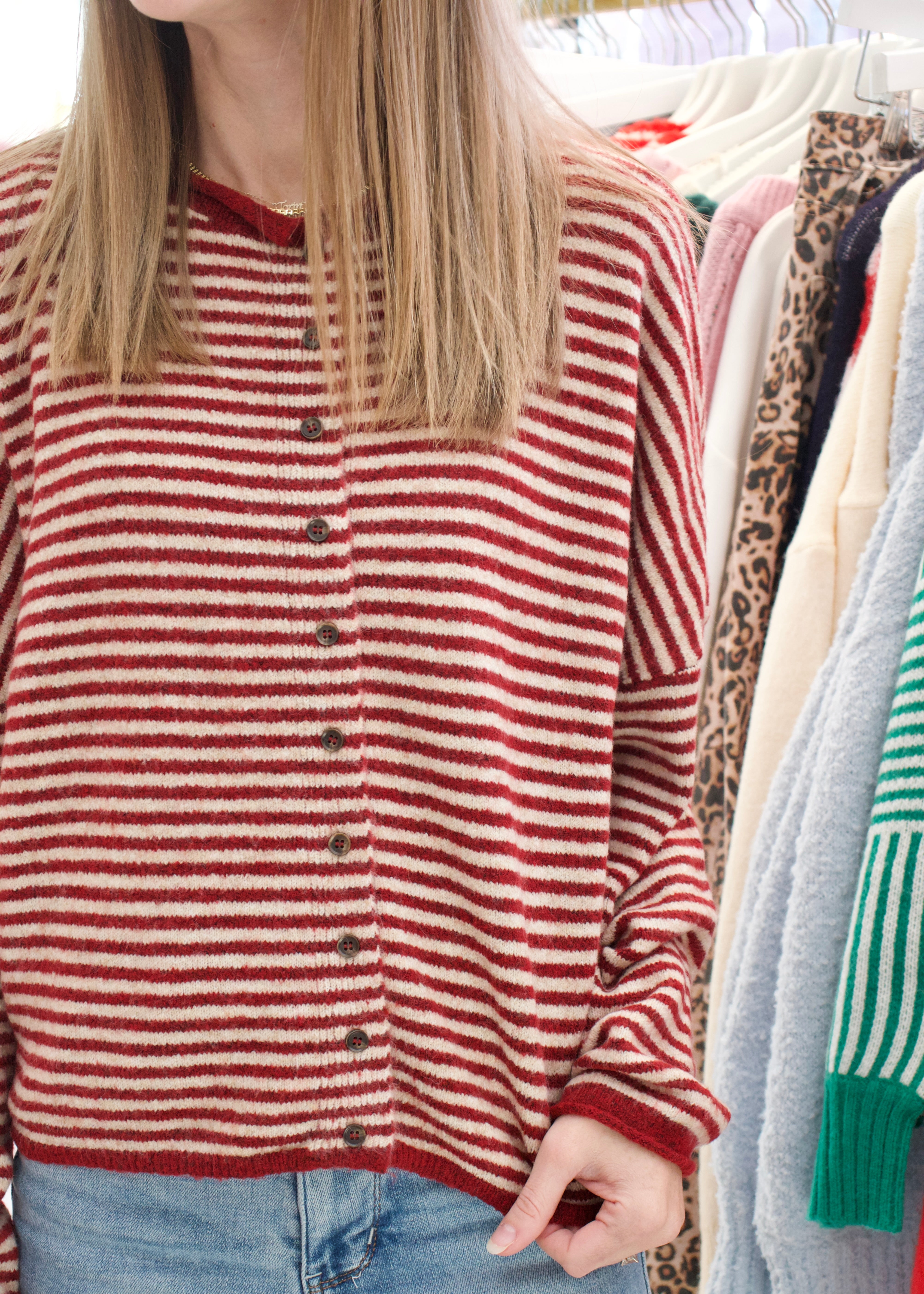 Wrap yourself in pure comfort with this irresistibly soft striped cardigan. Featuring alternating deep red and cream stripes, it's the kind of piece that feels like a cozy hug. The classic button closure makes layering effortless, while the luxurious knit fabric keeps you feeling pampered all day long. Perfect for those moments when you want to look put-together without sacrificing comfort.