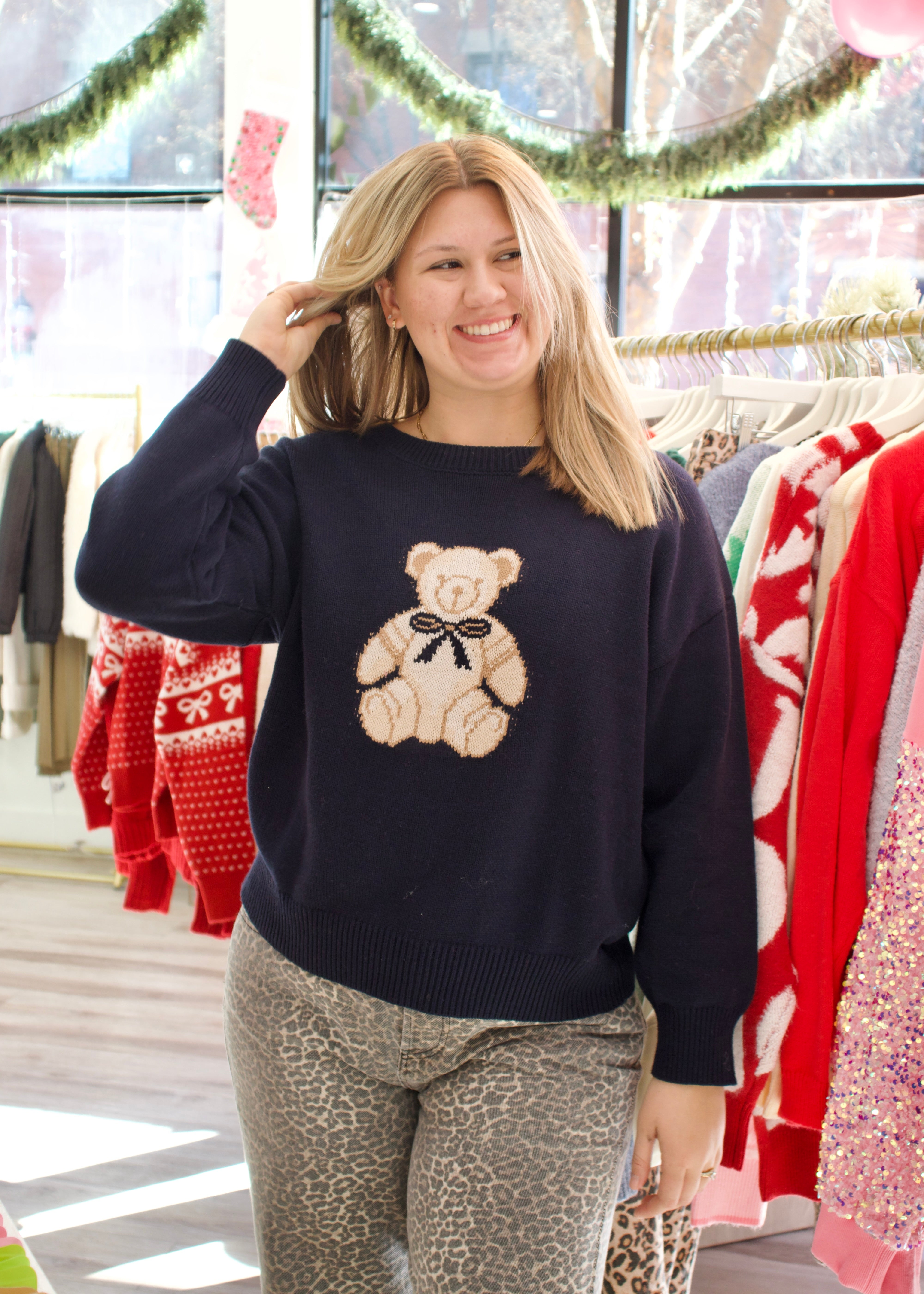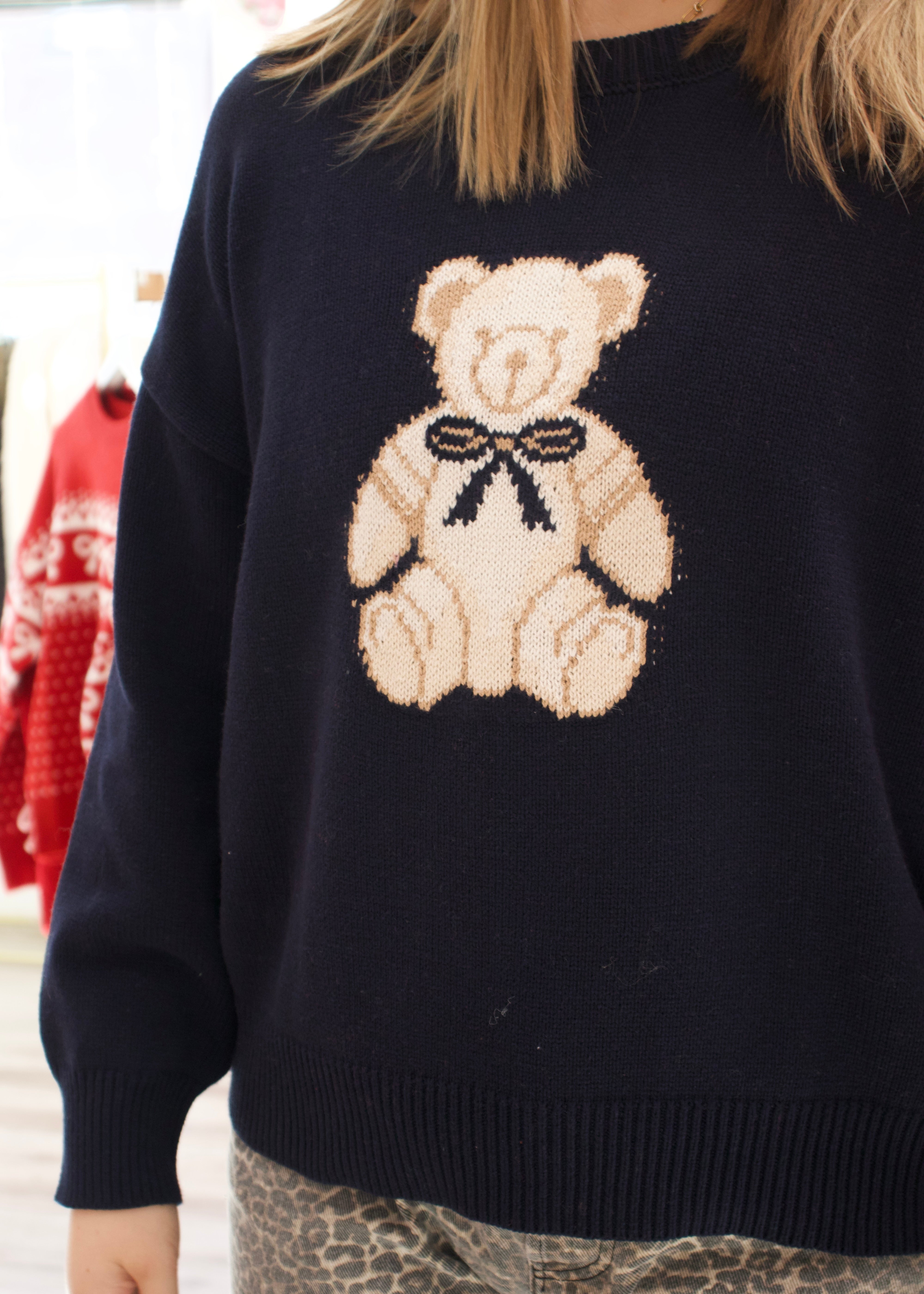 Wrap yourself in cozy charm with this navy Teddy Jacquard Sweater. Featuring an adorable teddy bear pattern woven throughout, this playful knit brings warmth and whimsy to your everyday wardrobe. The soft, comfortable fabric makes it perfect for casual days, while the timeless navy hue pairs effortlessly with your favorite jeans or skirts. A delightful piece that proves comfort and cuteness go hand in hand.