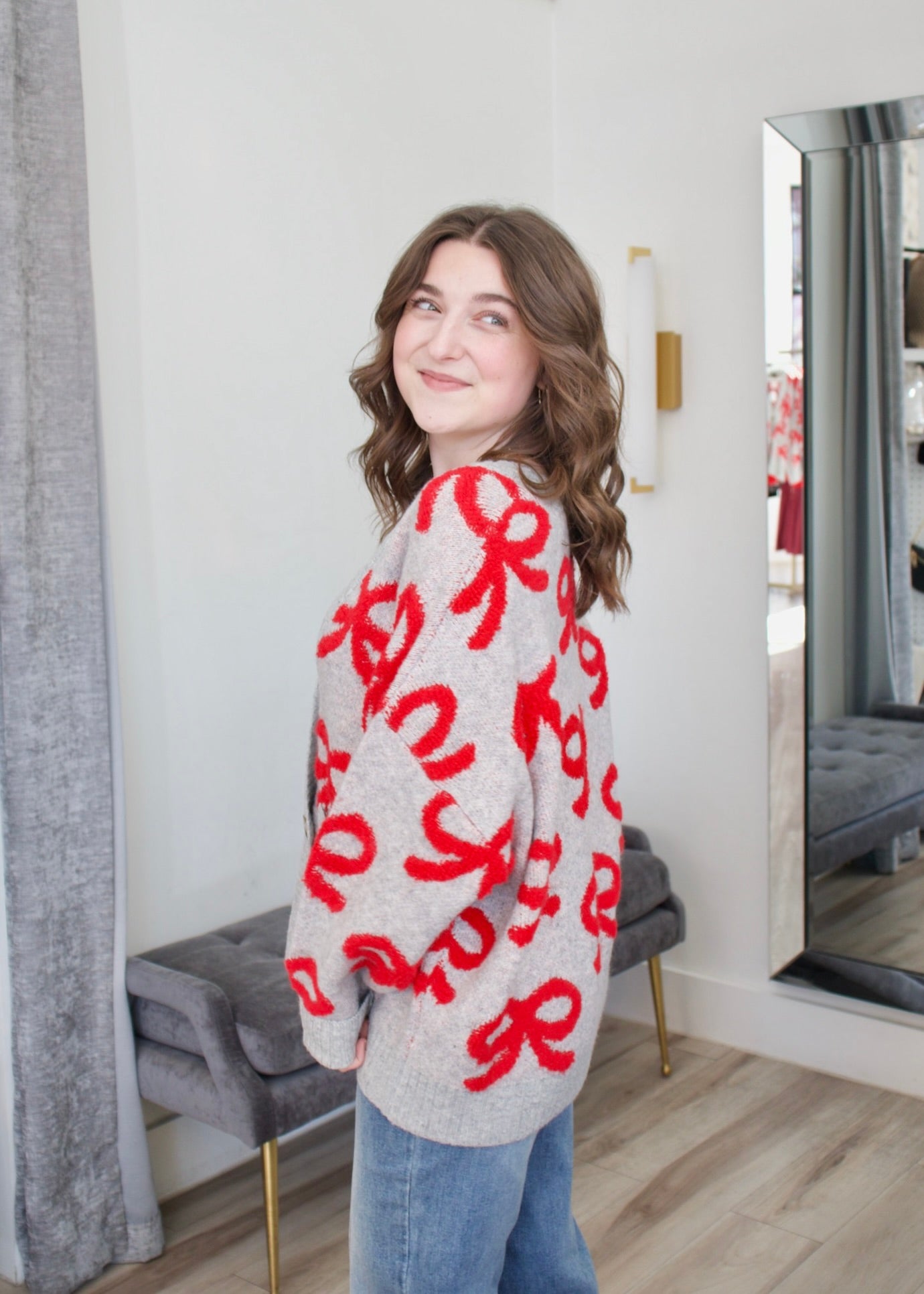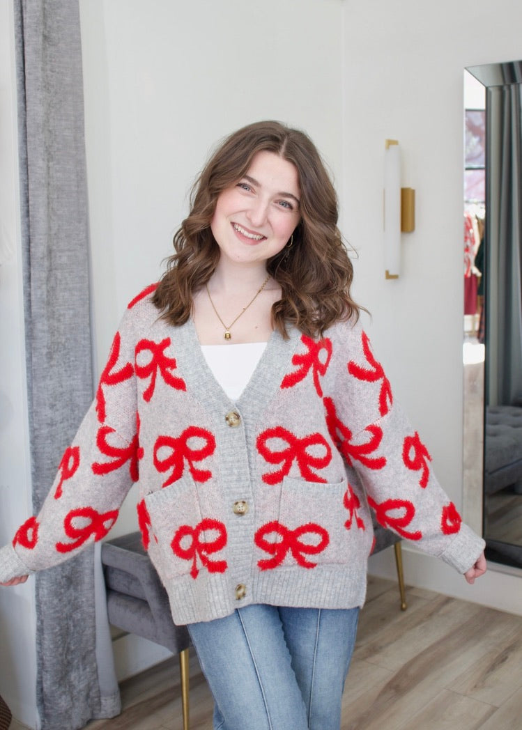 Wrap yourself in effortless charm with this oversized cardigan featuring an adorable bow detail. The relaxed V-neck silhouette drapes beautifully while the soft heather grey keeps things timeless and versatile. Perfect for layering over your favorite tee or dress, this cozy piece brings a playful touch to any outfit. Whether you're curling up at home or heading out for casual adventures, it's the cardigan that does it all with style and comfort.