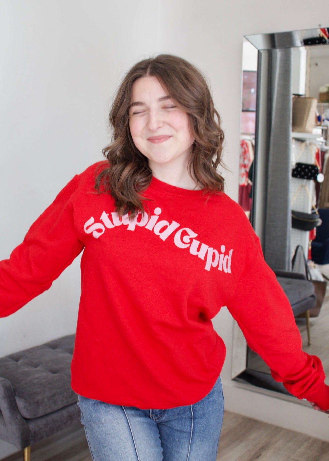 Get cozy and comfortable with our Stupid Cupid Sweatshirt! Made with soft material, this sweatshirt is perfect for lounging. So go ahead, cuddle up and relax in style!