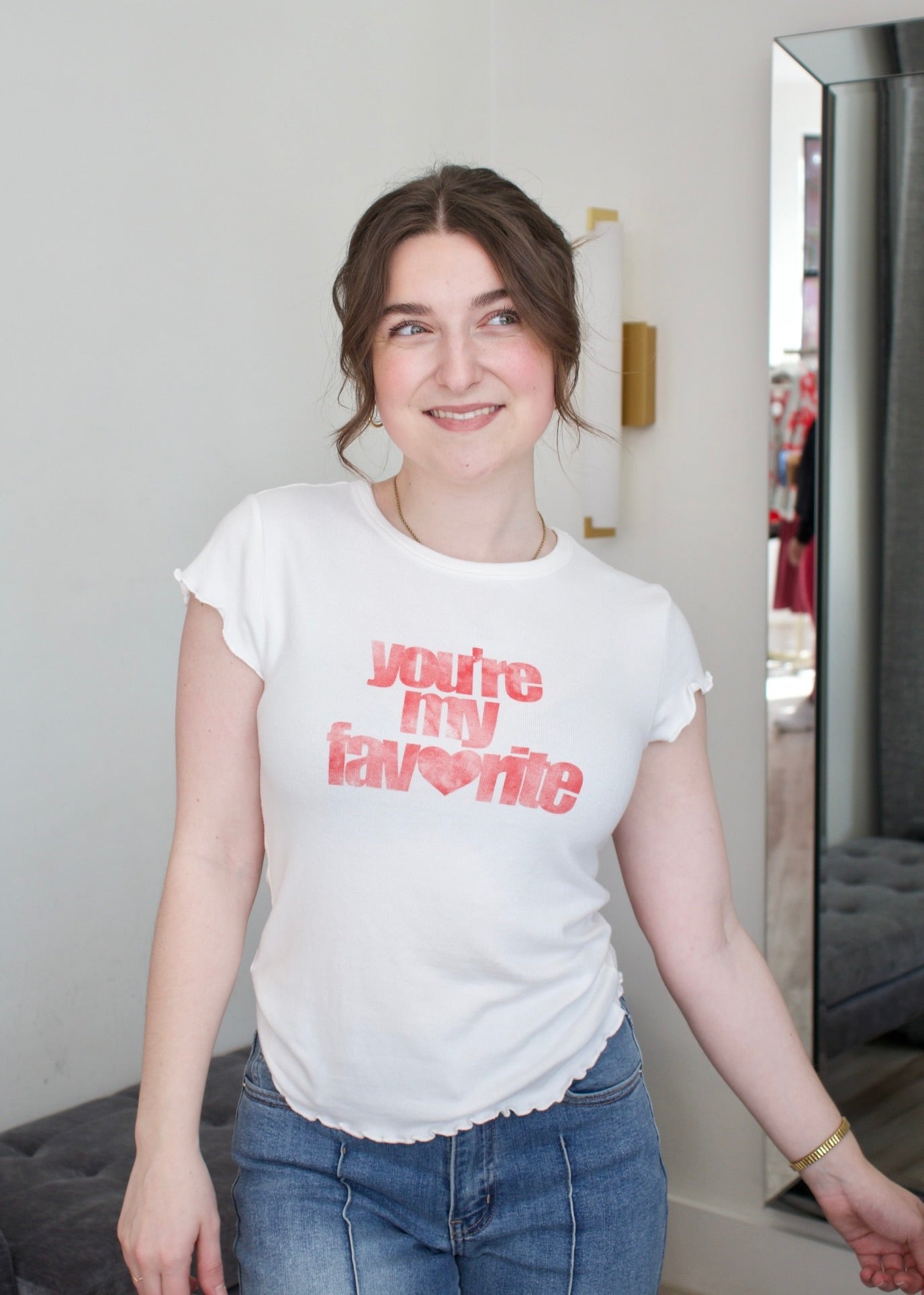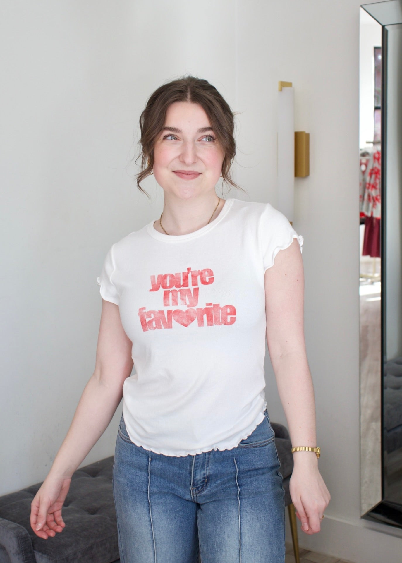 Indulge in love with the ZSupply You're My Favorite Tee in Vanilla Ice. The soft, white graphic tee features a playful lettuce hem for added style. Perfect for Valentine's or simply reminding your favorite person how much they mean to you. Show your passion with this must-have tee.