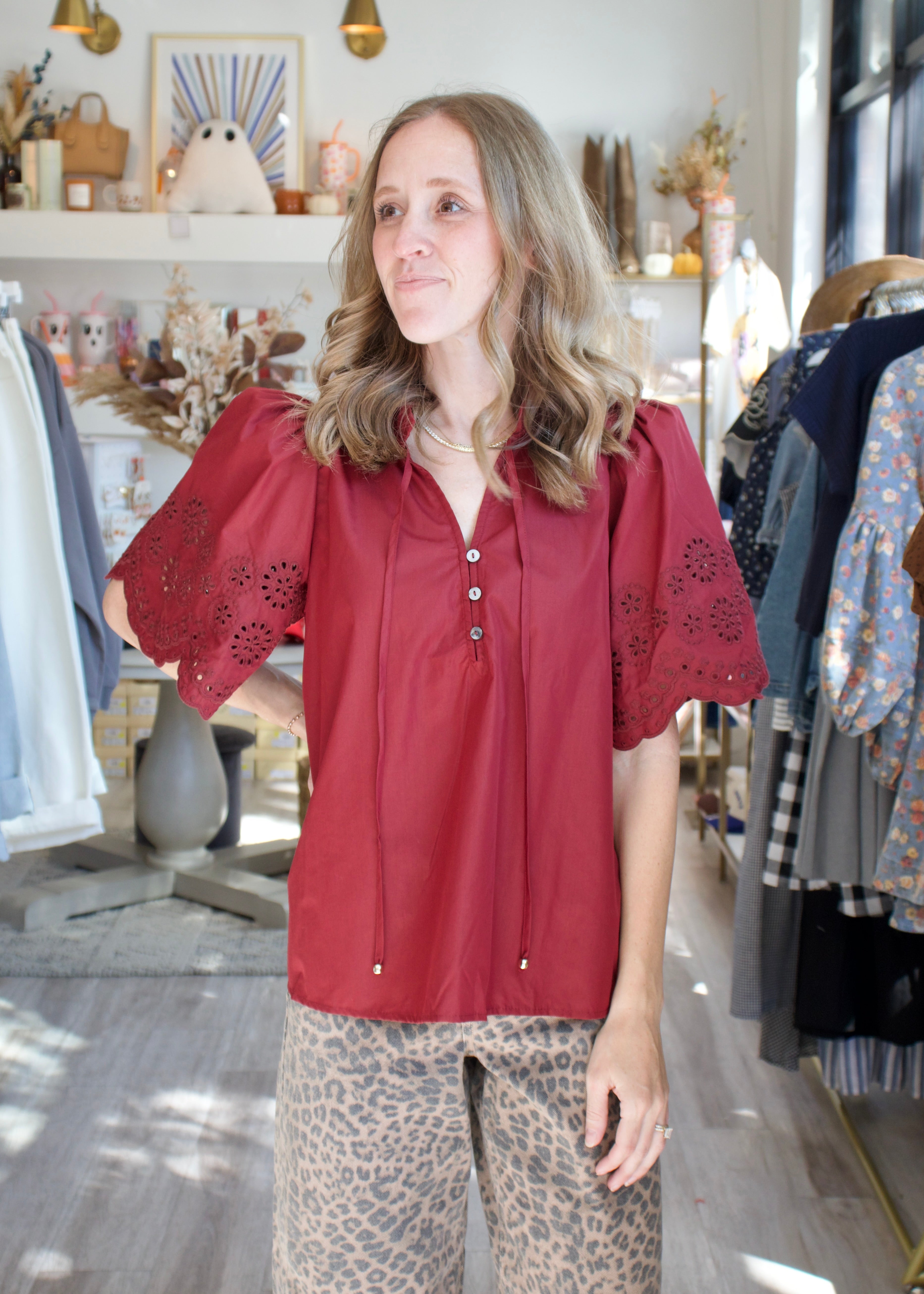 Eyelet Embroidery Short Sleeve Top - Burgundy