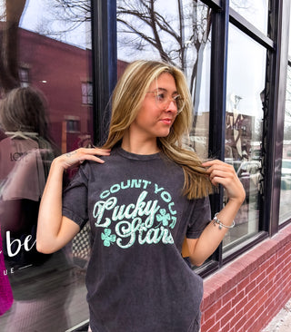 Embrace the luck of the Irish with our Count Your Lucky Stars Tee. This vintage-inspired tee features a unique black dye for a worn-in look. Perfect for St. Patrick's Day celebrations, this tee will have you counting your blessings and your lucky stars.