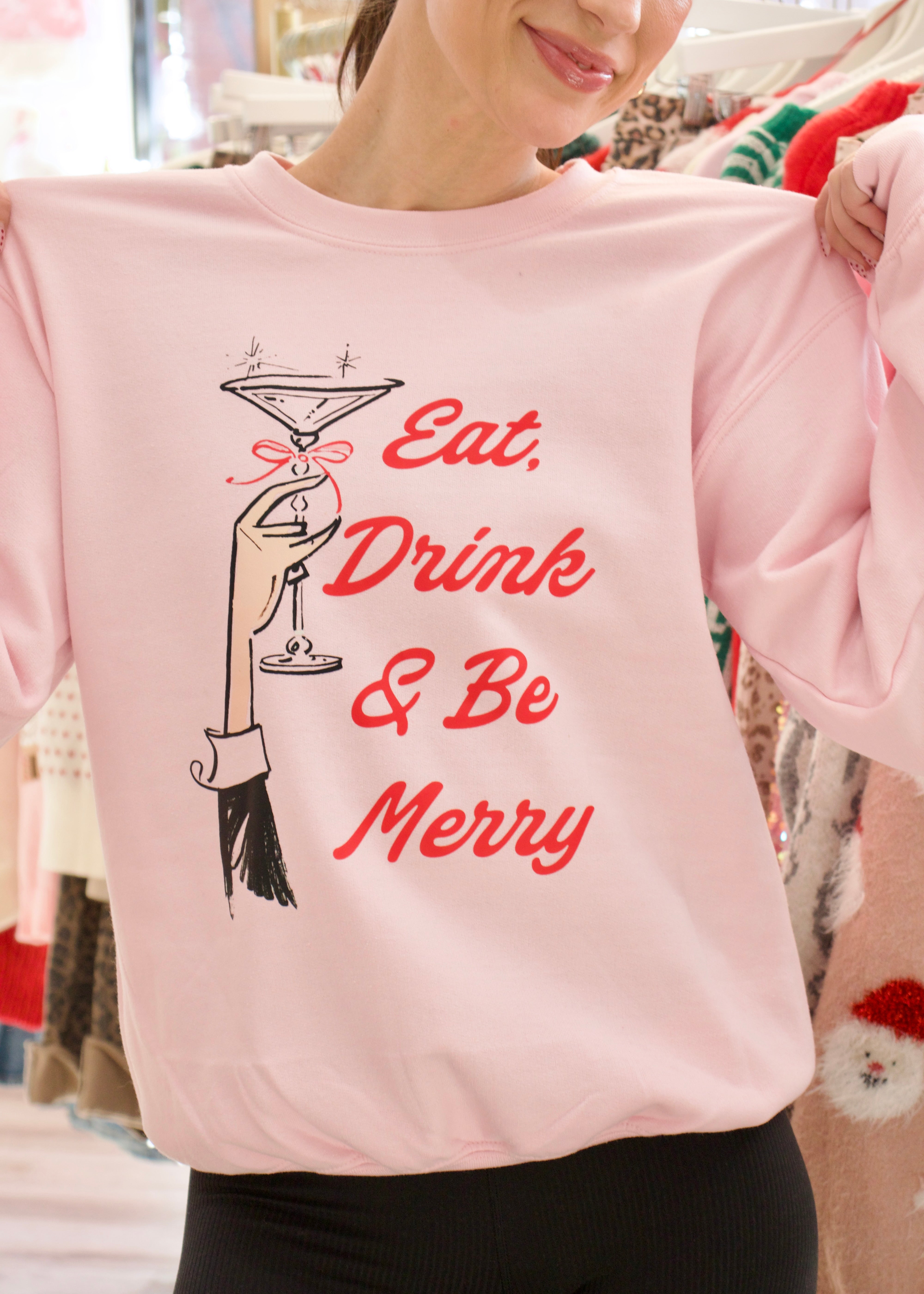 Toast to the season in this fabulous pink crewneck that's all about holiday indulgence! Featuring the timeless motto "Eat Drink & Be Merry" paired with festive drink graphics, it's your invitation to celebrate life's sweetest moments. Whether you're hosting a holiday party, enjoying seasonal cocktails with friends, or simply embracing the spirit of merriment, this sweatshirt says it all with style and sass. Cheers to comfort and cheer!