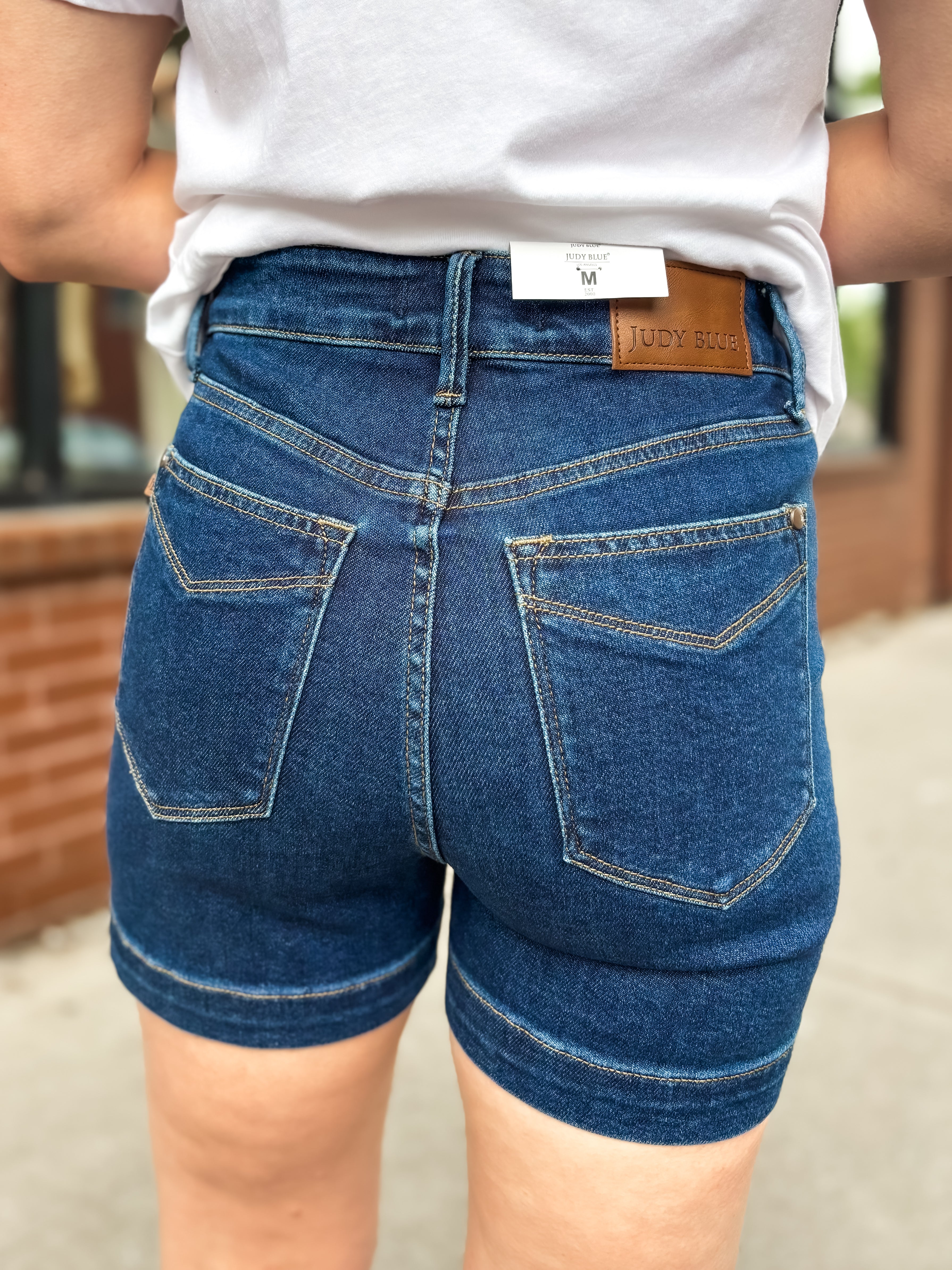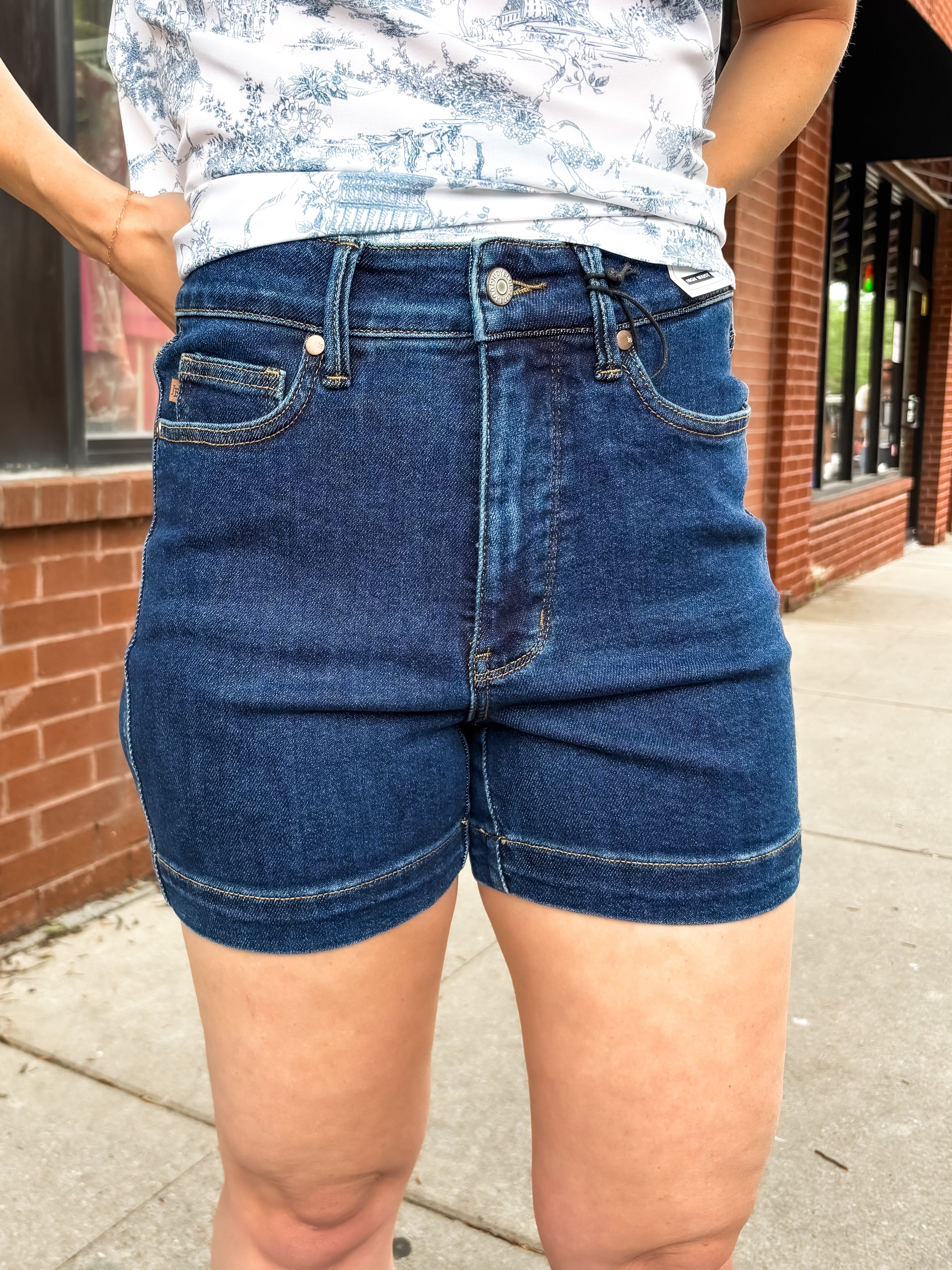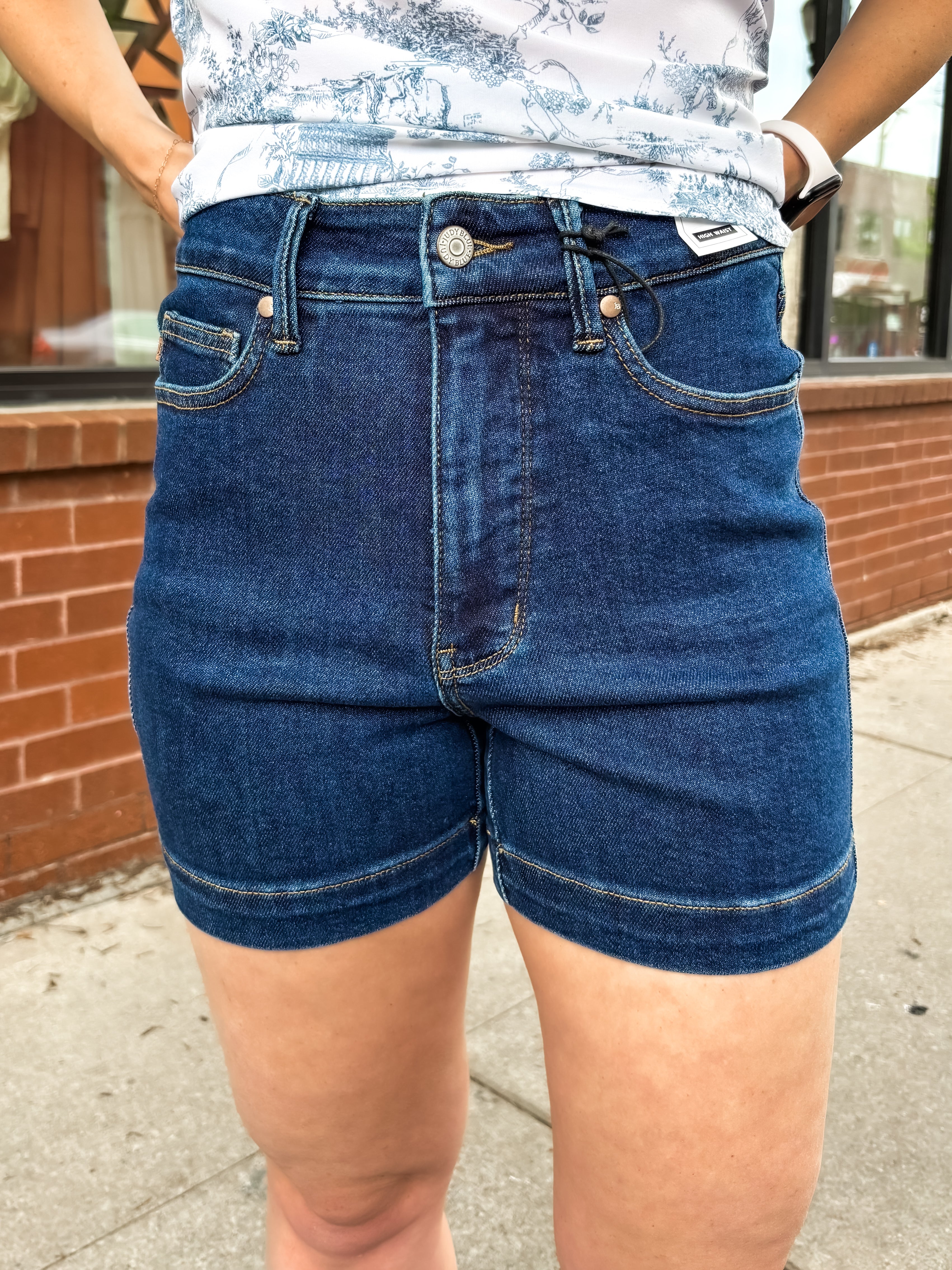These Judy Blue high-waist shorts in a flattering dark wash offer effective tummy control for a smooth, confident silhouette. Designed to enhance your shape while providing comfort, they are perfect for everyday wear or dressing up. Elevate your wardrobe with these stylish, figure-flattering shorts that combine fashion and function effortlessly.